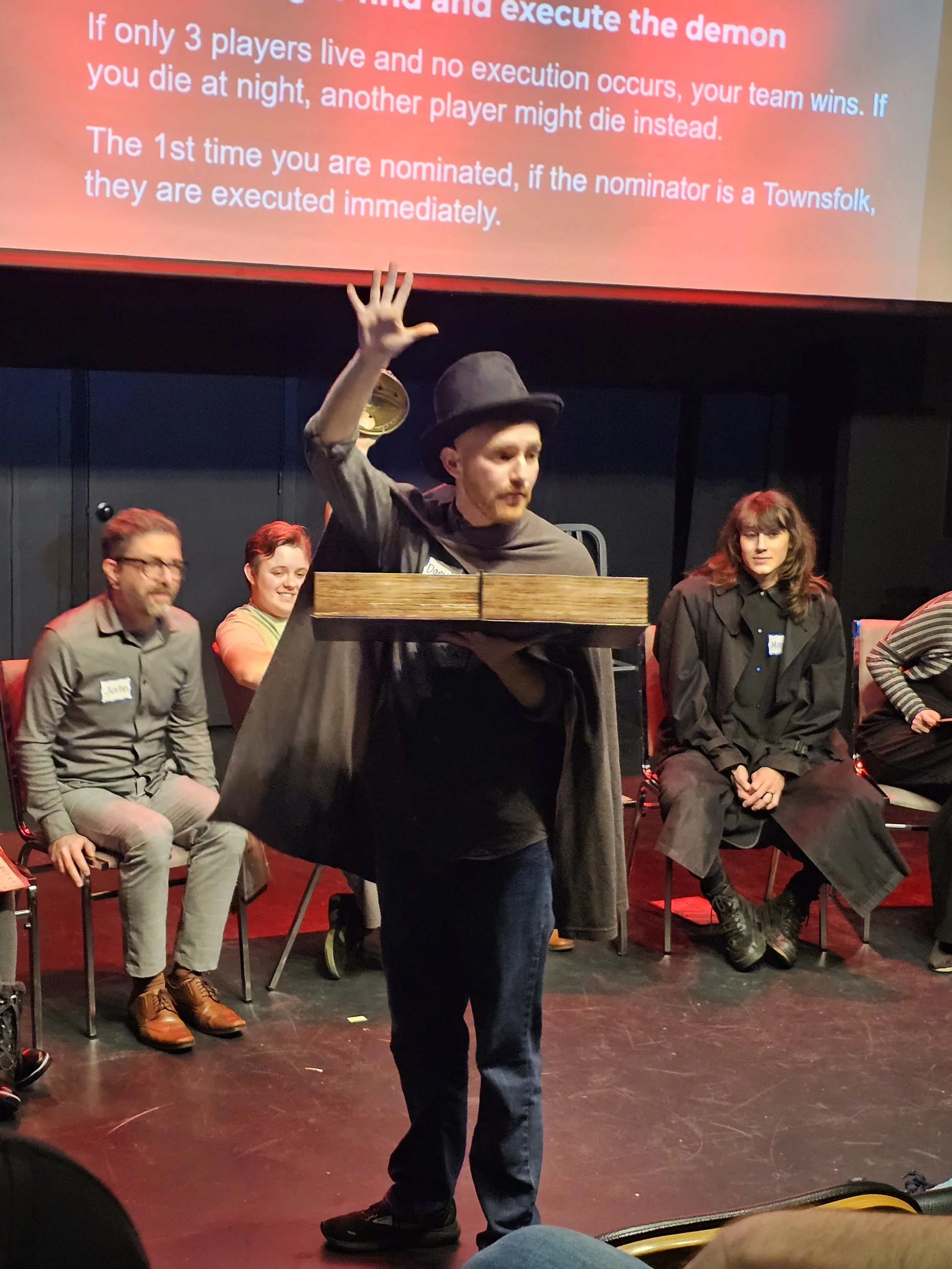 Twice a month, I put on live show play sessions of Blood on the Clocktower at Bellingham’s Upfront Theatre. It’s a social deduction game by the Pandemonium Institute that has all the logic, lies, and laughter of a murder mystery dinner party. During our show, audience members are invited to either join a cast of improv performers to play the game onstage or watch the shenanigans unfold. Come check us out at 9:30pm the First Thursday and Third Friday of every month! Tickets and more info are available here.
